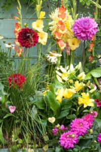 - Gladiolos – Sus flores largas y elegantes añaden altura al jardín y son ideales para arriates coloridos o como flores cortadas en un ramo estival.