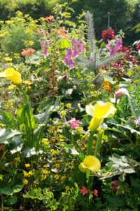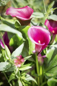 - Calas (Zantedeschia) – Con sus gráciles flores en forma de cáliz, aportan elegancia y un toque de lujo en macetas y arriates en los meses de verano.