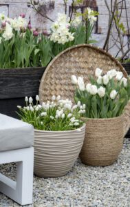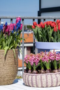 Un balcón o terraza ofrece posibilidades de sobra para crear una fiesta floral. Los bulbos de primavera se adaptan muy bien a macetas, jardineras, o incluso cubos y cestas. Además, los bulbos plantados en macetas son una solución flexible: puede ponerlos donde quiera. Colóquelos junto a la puerta de entrada, o en una balaustrada, o formando grupitos. Cuando las flores empiecen a brotar, crearán de inmediato un agradable ambiente primaveral.